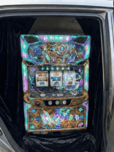後席ドア部には、スロットを二台搭載できるように設計しました。ワイヤー等で固定することができ、走行も問題ありません。(画像のスロットマシンは、AIによって生成しましたイメージです。)