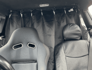 運転席と後部をカーテンで完全に分断し、送迎車のような世界観を演出しました。走行時にスライドし開けることで、後方確認もできるように設計しました。