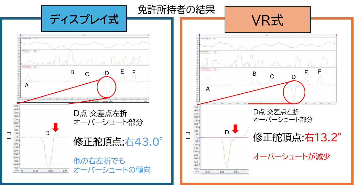 実験結果より、VR式ではステアリング舵角の変動が小さく、 特に走行コース中のD点において安定した操作が行われる傾向が確認されました。 これは、立体視および視点移動が可能な環境により、車両位置や進行方向を 直感的に把握しやすくなったことが要因であると考えられます。