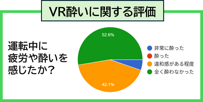 実車に近い感覚が得られる反面、慣れていない被験者にはVR酔い等の生理的負荷が生じる可能性がある |