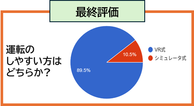 実験結果およびアンケート結果から、VR式は没入感や距離感の把握に優れる一方で、身体的負担や個人差といった課題も存在することが確認されました。
